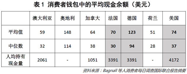 其他各国同样如此。2014年澳大利亚、德国、法国等七国中央银行联合调查显示,消费者对现金的需求并不能解释现存的现金供应量(见表1)。