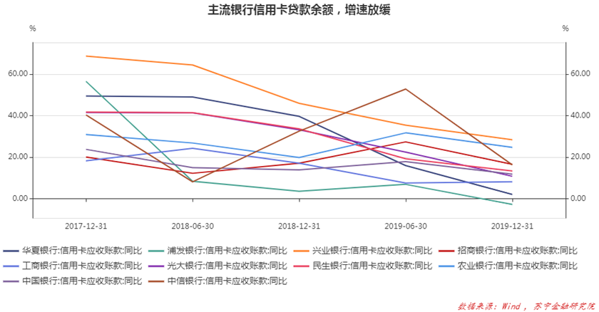 2019年末,主流银行的信用卡贷款余额增速全面放缓。一般的解读是银行主动为之、主动放慢步伐。这个解读有数据支持,比如新增持卡人的快速下降,比如不良率的抬升。