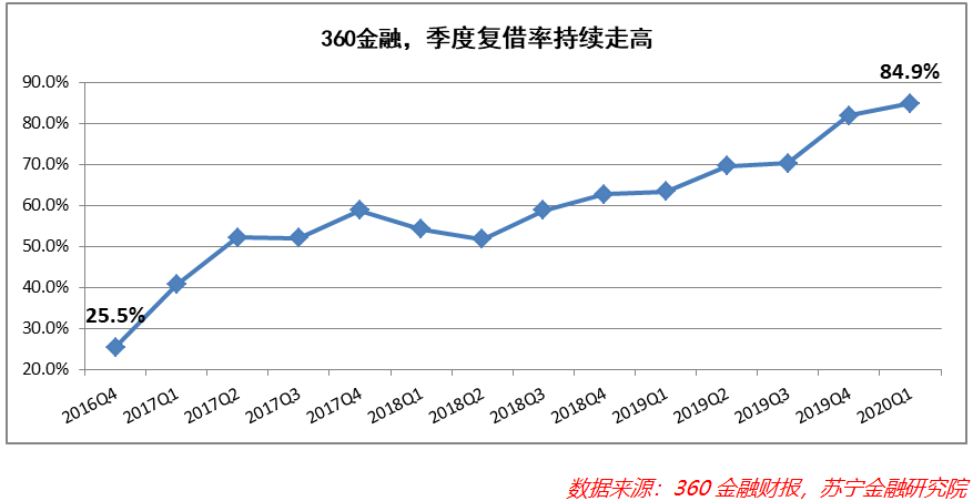 以360金融为例,2020Q1的季度复借率已升至84.9%。类似趣店等平台,早在2018年复借率就达到90%以上,几乎成了缺乏新鲜血液注入的封闭系统。