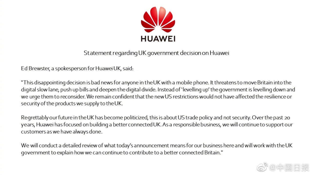 虽然华为已经对英国政府这个决定给出了一个“不卑不亢”的回应: