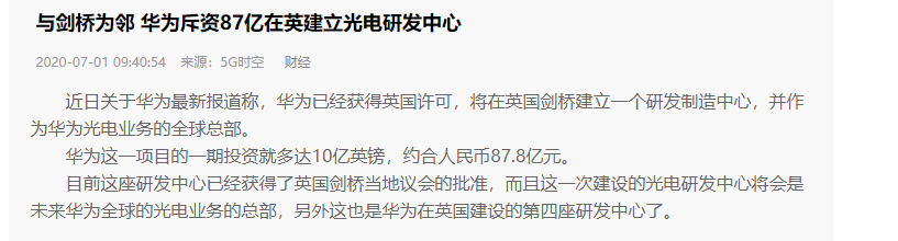 就在这个月月初,新闻还说华为投资了10亿英镑,在剑桥建立研发制造中心,用来当作华为光电业务的全球总部。