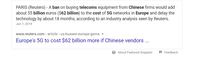 有数据统计称,在保证质量相同的情况下,华为在欧洲5G设备的报价,比它的竞争对手低大约20%左右——这还是有华为的情况下,如果华为被禁止,对手势必会继续提价。
