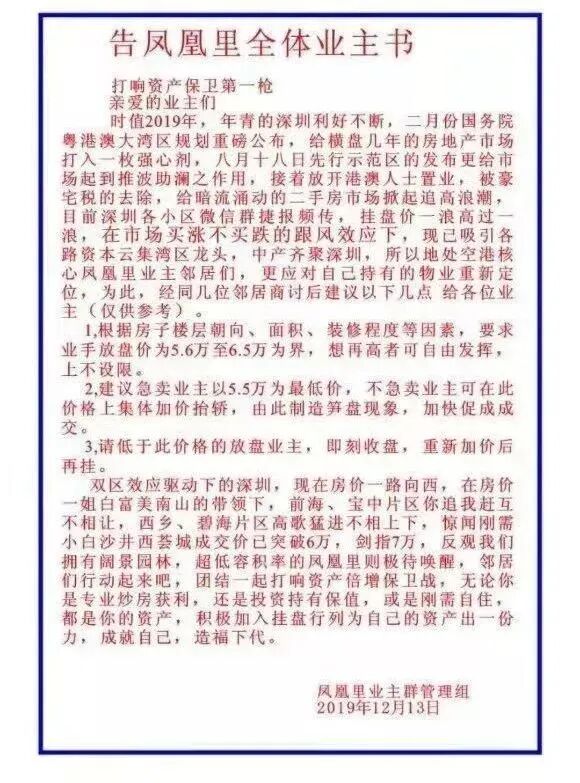 近半年来,或者说近一年来,深圳的房价走势吸引了全国人的注意力。深圳房价涨的实在是太猛了,尤其是在全国大部分城市的房价都不涨甚至是微跌的背景上,显得更为独特。连我在写全国房价分析走势的时候,都要特别注明一句,“除深圳外”,因为深圳真的太不一样了。北上深这三个超级城市里,唯独深圳是不限购的,外地人可以来深圳轻易买房。深圳是由外地人建立起来的,“来了就是深圳人”这是深圳一贯的执政思想,限购这种政策天然就被深圳排斥,能不用就不用。但是在全国降息,乃至于全球降息及货币宽松的大背景下,大量的资金因此涌入了深圳,推动了深圳房价的连续上涨。2019年双11这天,深圳宣布了一个小政策,不再以价格作为豪宅的认定标准,而是以面积为准,单套建筑面积在144平米以下的房子定为普通住宅,免征增值税。这政策本来没啥,但却成了最后一根稻草,深圳房价被彻底引爆了。2019年底,一封文采飞扬的《告凤凰里全体业主书》疯传网络,其操作手法令全国人目瞪口呆。