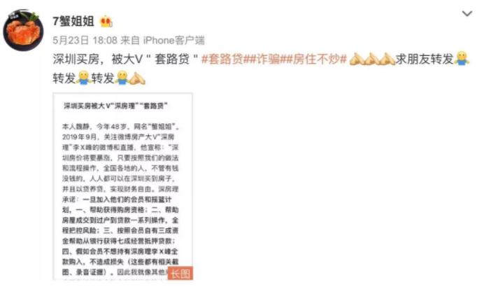 深圳的企业太多,税源太广,完全没有必要依赖土地财政,房价的拉升对深圳政府的好处并不大,对城市整体吸引力的影响倒不小。深圳人的收入支撑不起那么高的房价,深圳政府也没有拉升地价的动力,那为什么我们却看到了一个狂飙突进的房价走势?深圳房价上涨那么久了,屡次“调控”依然没能遏制房价疯涨的势头,这让全国的投资客们纷纷笃定自己的猜测。没错,就是假调控,真涨价,利用深圳房价来带动全国。在深圳房价疯涨的带动下,很多地方的楼市也开始蠢蠢欲动了,各地开发商唯恐被人“捡了便宜”,纷纷提高自己的售价。以前把1000万存银行,一年可以拿到60万的理财收益。后来只能拿50万了,再后来只能拿40万了,而现在能拿到30几万就不错了。在全球疯狂放水降息的大背景下,深圳房价出现这种涨势,确实是有可能拉动全国房价再起一轮上涨的。对于全国的投资客而言,甭管其他地区是否跟涨,至少深圳是在涨的。2020年5月,一名在苏州卖大闸蟹的“7蟹姐姐”在微博发文控诉某大V,声称被其欺骗,导致自己价值728万元的深圳房产被查封。
