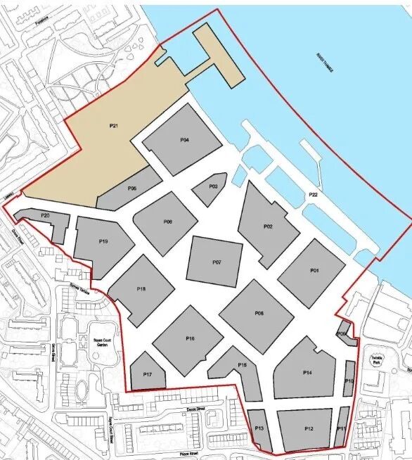 22号比较特殊,是在码头延伸到泰晤士河中央的一块公共开放空间,包括一些展示空间和未来与泰晤士河快船网络连接的“河上公共汽车”浮桥。
