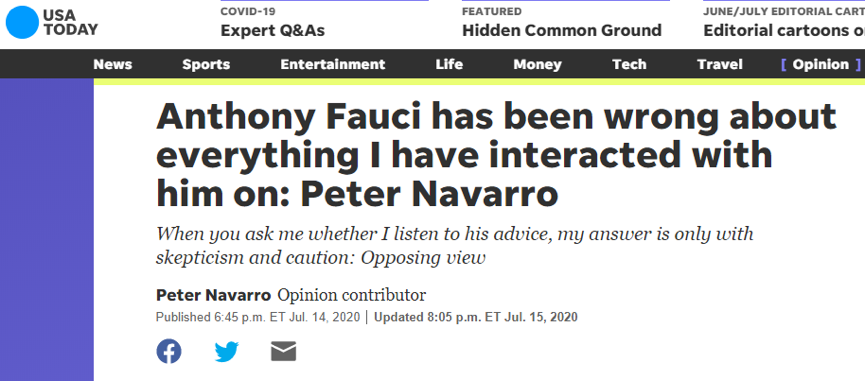 譬如,这次新冠疫情的锅,本来是特朗普领导的白宫的,结果在过去几个月时间里,美国却一直要甩给中国。然而,无论怎么甩,疫情都是在美国,而中国现在却没有疫情了,在这种情况下,虽然有7成的美国人糊涂信了,但国际社会却绝大部分国家都不信,美国的甩锅也几乎无法获得更多响应,这也意味着特朗普甩锅给中国的计划失败了!甩锅中国失败,疫情却越来越严重,在新冠确诊每天达到6万左右时,特朗普的新冠甩锅计划还得继续。那么,接下来这个锅甩给谁合适呢?思来想去,特朗普团队终于想到了一个人,那就是白宫首席防疫专家——福奇。为了照顾领导面子,福奇其实已经是非常隐忍,但他对特朗普太了解了,所以为了避免自己成为背锅侠,他还是经常在媒体上说明一些真相,这真相也让特朗普很恼火,福奇一度有被炒的风险。然而,特朗普没有炒他,估计就是准备将来让他背锅。果然,让福奇背锅的时候到了!据环球网转引美媒的报道称,大家熟知的敌视中国的白宫贸易顾问纳瓦罗突然向福奇开炮,说美国政府疫情防控之所以失利,责任完全是在安东尼·福奇。他在文章里对福奇大加攻击,他说福奇全错了,是他早在今年1月底就向白宫发出了警告,让白宫警惕这种“中国病毒”,当时福奇却一直在对美国媒体表示不用担心,而且当特朗普“勇敢”地宣布要切断与中国的航线时,是福奇一直在反对这一本可以“挽救”成千上万美国人性命的举措。纳瓦罗这篇攻击福奇的文章,恰恰又打了自己的脸,之前包括特朗普在内的美国政要攻击中国没有向美国通报,现在又说1月底就发出了警告,还把病毒称作“中国病毒”,请问这不是自打脸吗?既然当时你们已经讨论了,并且最终还是限制了中国到美国的航班,那又如何将疫情的责任归于中国?由此我们可以看出,美国政府就是这样,攻击谁都不讲逻辑,只是攻击!纳瓦罗还攻击福奇说,2月时,当他在为特朗普卖力地调动美国的医疗资源准备应对疫情时,是福奇在不断淡化疫情在美国的风险;当他在努力增加美国的口罩产量时,也是福奇在戴不戴口罩上变来变去。既然美国2月就开始调动资源应对疫情了,怎么能把责任归于中国?是你们自己应对不到位而已。现在,不攻击中国了,把同样的事再对福奇攻击一遍。事实上,是福奇那么说的吗?翻看新闻,是特朗普说的!