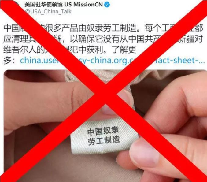 我想起了前不久,美国大使馆官方账号,在一则污蔑“中国政府在新疆侵犯人权”的转推中,放出叫嚣中国制造是“奴隶劳工”制造的一张拙劣P图,并声称美国企业要清理含有中国这类产品的供应链。