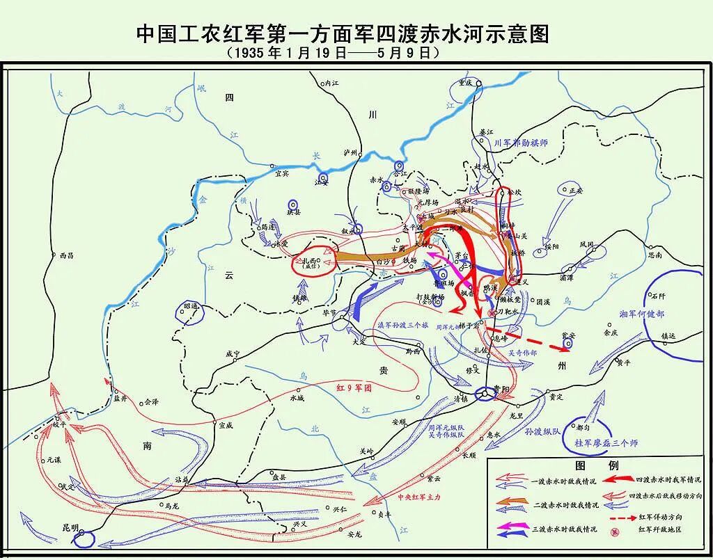 于是毛泽东带着红军四渡赤水向北走,然后快速折返向南,过乌江后直扑贵阳,虚晃一枪继续沿边界向西南走,就此逃出生天。