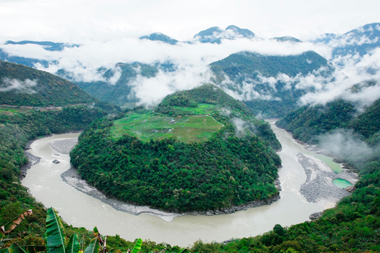 雅鲁藏布江大拐弯处云雾缭绕。