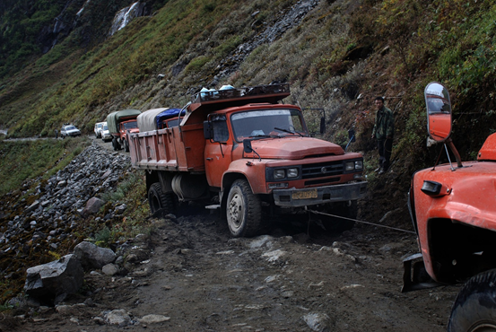 墨脱境内的一辆卡车牵引陷入淤泥的货车。