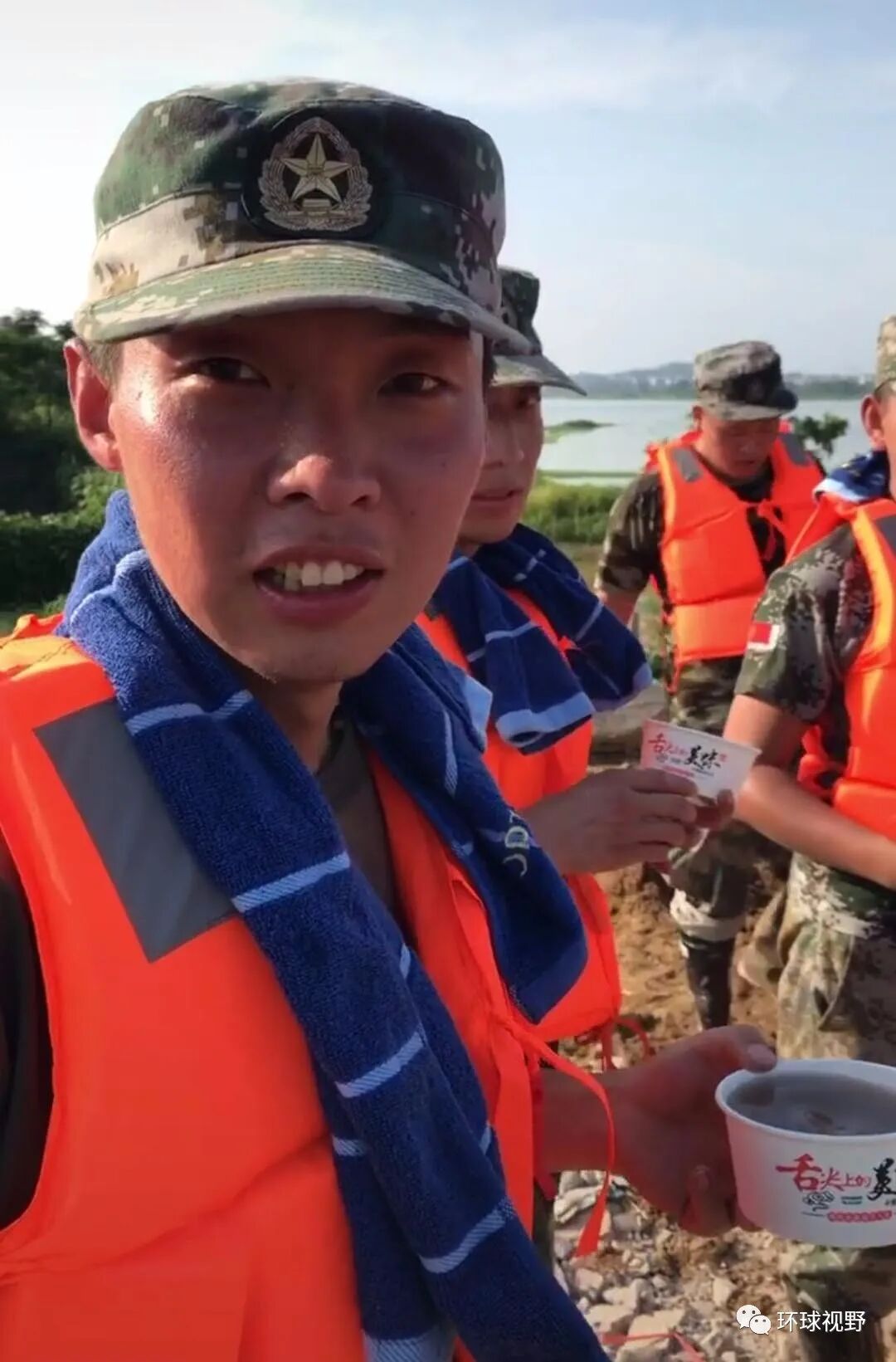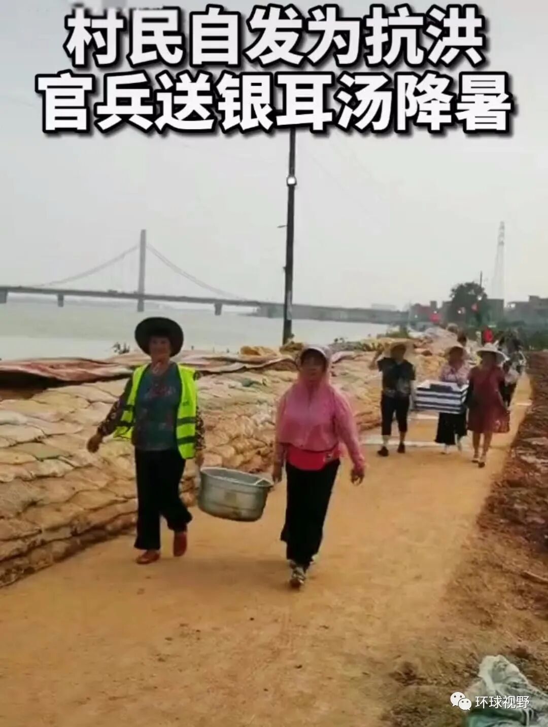 7月15日,江西鄱阳抗洪现场,大叔大娘们给战士送去银耳汤降暑,还有包子等食物。
