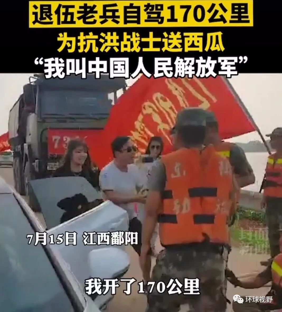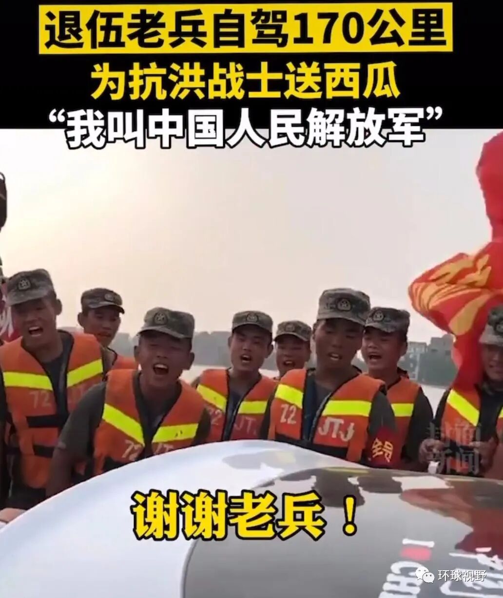7月15日,还是在江西鄱阳,一位退伍老兵驱车170多公里,用私家车拉了满满一车西瓜送给抗洪将士,当别人问他叫什么名字时,他说自己名叫“中国人民解放军”,而那些奋战将士齐刷刷说了一句:“谢谢老兵”。
