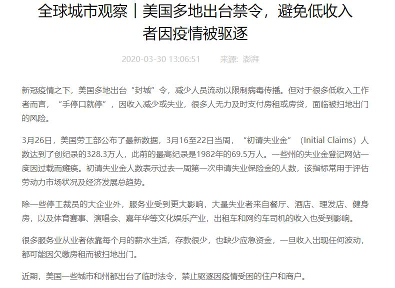 为了保护这部分低收入群体,也为了更好地执行“封城”令,美国地方政府便出台了禁止驱逐令。