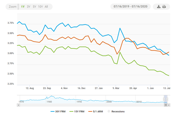 美国抵押贷款利率已连续数周创下历史新低。5月15日,30年期固定利率抵押贷款的平均利率降至3.09%。更有甚者,部分放贷机构给出了2.75%的利率。
