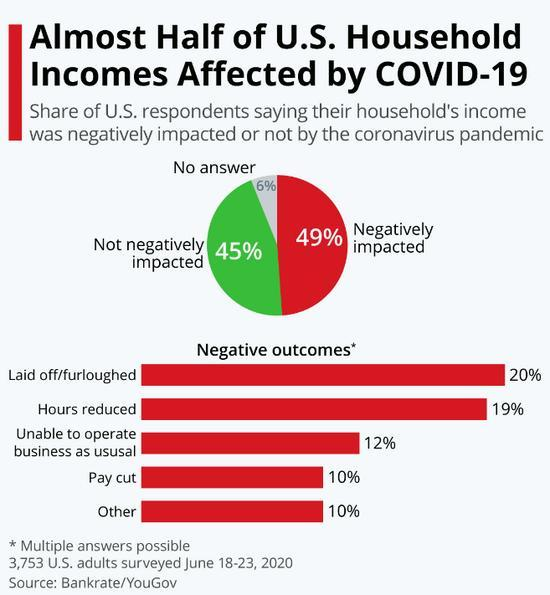 Bankrate和YouGov调查显示,由于疫情影响,有近一半的美国家庭收入下降。