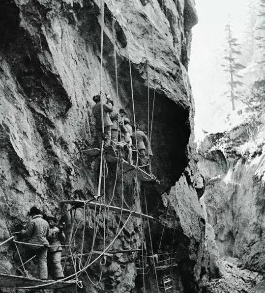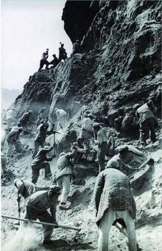 解放军官兵部队,靠铁锹、钢钎等极为简陋的工具,开凿公路。