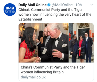 最近,英国《每日邮报》刊出这样一篇文章:“中国共产党和虎女们正在对英国施加影响。”