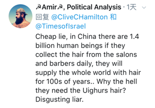 一个穆斯林网友回复说:“廉价的谎言,中国有14亿人口,他们想要头发的话,每天从沙龙和理发店就可以收集到可供全世界消费100多年的头发,为什么他们非要需要维吾尔人的头发。令人作呕的谎言。”