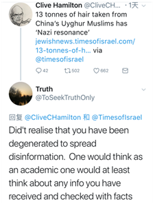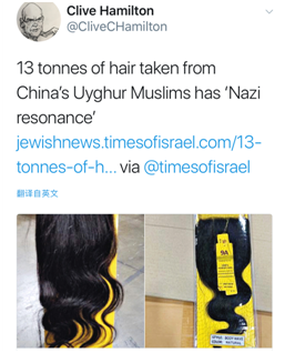 作为澳大利亚智库学者,在社交媒体上,他最新发表的推文是这样一个耸人听闻的信息,“13吨进口头发商品取自中国维吾尔穆斯林,纳粹复活!”