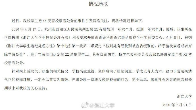 那些有利于国家发展和社会稳定的照顾,虽然我们有时候感到不公平,但是还是理解和接受的。没想到,这照顾着照顾着,竟然还照顾起犯罪分子来了?20日,浙大对于犯强奸罪的努尔特·巴特尔给予留校处分一事引起巨大的争议。比如,努尔特·巴特尔成绩很差、经常出入酒吧、不是初犯、经常侵害小学妹……还有就是,被判刑后根本没有“强烈悔改”,而是秀恩爱……一片歌舞升平的样子。一方面表示,自己对努尔特·巴特尔的处分合规,一方面表示调查事实真相。但是,仍然无法阻挡浙大因为这件事而在民众心中的形象大打折扣。比如,昨天的另外一个热搜#哈工大两名大四学生因作弊被开除学籍#,以及前两天“中科大开除境外发表不当言论的季子越”。还有就是,浙大自己本身对违规学生的处分似乎也有严重的问题。比如,浙大对于猥亵女生、吸毒等触犯了法律底线的学生,采取的是“留校察看”的处分。