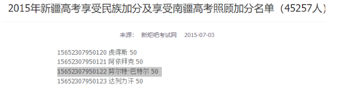 比如,努尔特·巴特尔高中是在深圳市坪山高级中学读的。这是2013年,但是2015年,他却在新疆高考,享受50分加分,考到浙江大学少民预科班。