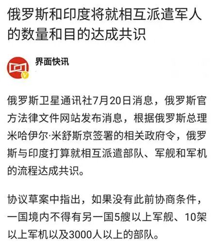 俄罗斯卫星网7月20日报道,根据俄方公布的俄印协议草案,允许两国在对方领土和领海部署5艘以内的军舰、10架以内的战机以及3000人以内的地面部队。