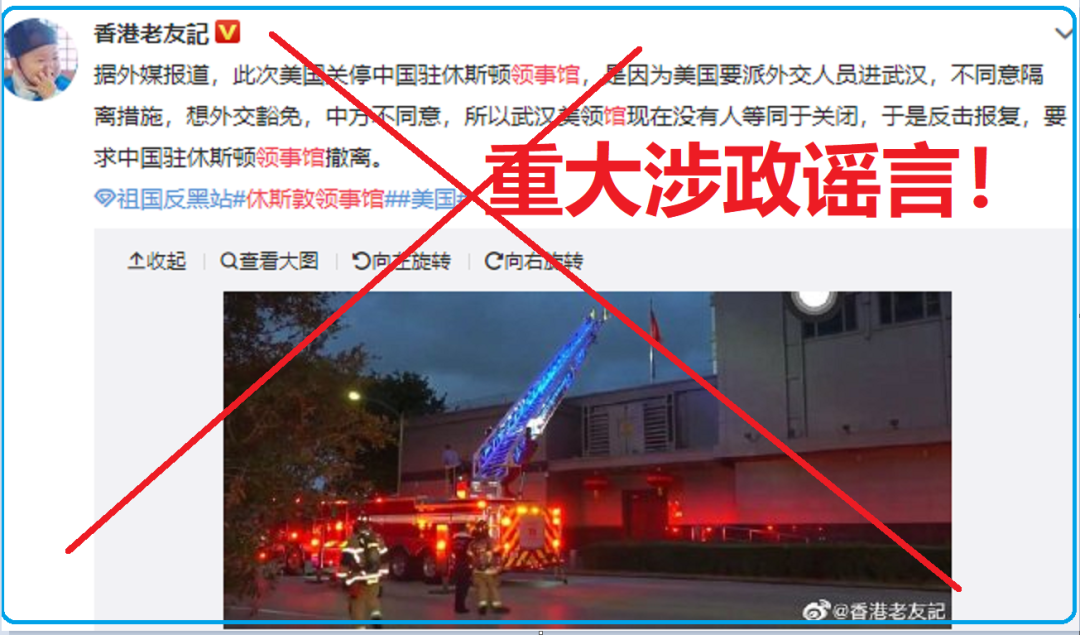 首先美国这次突然无理蛮横要求立刻关闭中国驻休领馆事件,想必大家都已经知道了。但笔者想提醒大家注意的是:美国此次蛮横无理勒令闭馆事件的整个操作过程中,仍有一处致命的有毒微操,这一处舆论谣言微操十分精妙、十分狠毒,影响极大,是在美国决定蛮横无理勒令闭馆之前就已经准备好了的舆情核弹,并且在闭馆消息传出的30秒内就开始通过自媒体平台疯狂散播。