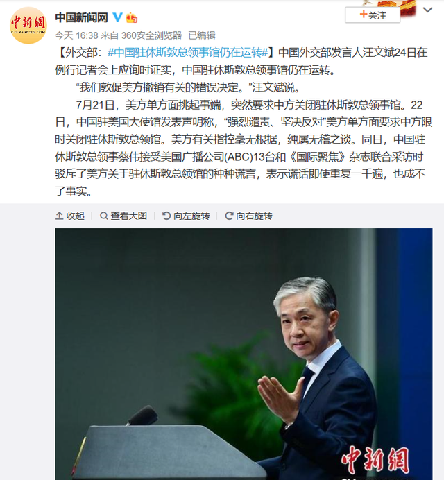 中国驻休斯顿总领馆还在运行的消息7月24日获得了中国外交部发言人汪文斌的证实,他在例行记者会上表示,中国驻休斯敦总领事馆仍在运转。“我们敦促美方撤销有关的错误决定。”汪文斌说。