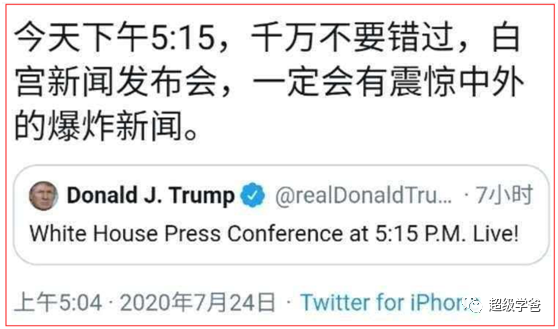 目前特朗普已经在推特上预告了,美国时间24日下午5:15分(北京时间25日早上5:15分),将会发布爆炸性消息。