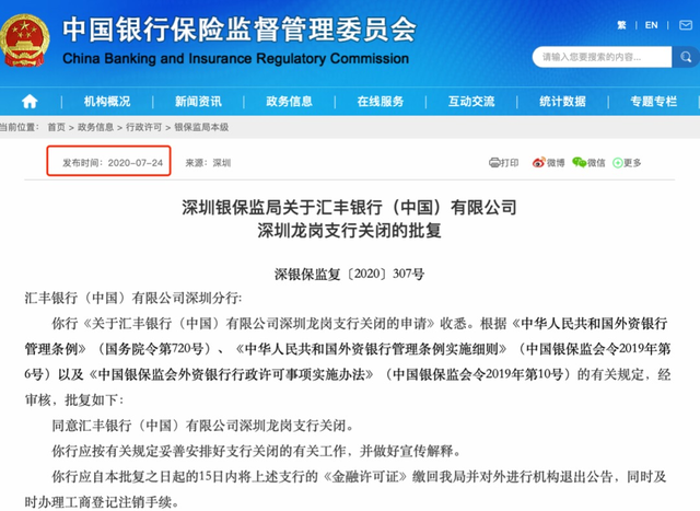 据深圳银保监局官网显示,深圳银保监会批复了汇丰银行(中国)有限公司深圳龙岗支行关闭的申请。为啥申请关闭?那是因为已经经营不下去了!虽然,中国没有主动出手,但你无法经营的时候,只能申请关闭了。另外,汇丰在中国、在香港的业务未来都会被严重压缩,甚至可能被迫退出中国。