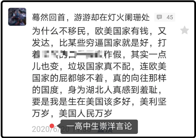 还有,我在今年二月份写了一篇稿子,撰稿的目的是在欧洲归国的笔者警示国人警惕西方疫情。结果文章一出,骂声一片,北京的留学机构“意视窗”还专门写了一篇稿子全网挖苦笔者,意思大概是欧洲那边一片祥和,医疗系统发达可靠,不要听郎言志胡说八道。好家伙,很多华人和留学生听了他们的鬼话不做准备,结果不出几天,整个欧洲疫情失控,很多人因此滞留了,那惨烈的状况大家也都看见了。到底怎样的一种“热爱”,才会让他们如此昧着良心四处跪舔呢?再比如,前几日我写了一篇关于美国封禁中国抖音TikTok的文章,指出了美国在事件过程中的霸权行为与幕后黑幕。可文章发布后不久,便迎来了一片喷:支持美国封禁TikTok的手段,为美国点赞。根据IP和后台信息显示,这些人一部分是疫情期间享受国家恩惠的海外华人,一部分是享受大陆社会建设发展红利的大陆网民。我总结发现他们的逻辑很神奇:因为中国封了谷歌和脸书,所以美国此举理所应当,因为华为没有听美国的话,所以被封是顺理成章。我问这些人“谷歌是对抗中国法律法规被封,TikTok是顺着美国的法律法规被封,能一样吗?”结果,假洋鬼子们依旧振振有词,回了我一句“你国有法律吗”。我没有再与他们进行争论,只是问了他们一个问题:若是国家垮了,你们会更幸福吗?美国的资本家会照顾你们一辈子吗?其实这些人我们多数人都接触到过,比如之前写《2020,美国亡于中文媒体》的那一批人,面对中文媒体对西方、对美国疫情的担忧,这些人的自尊心受创程度比西方白人还要高。于是,他们便开始各种辟谣、包装以美国为首的西方社会:疫情不严重,生活很幸福,中文媒体胡说八道。好家伙,那几十万个大活人都是在“幸福中死去”的哦?承认一下西方疫情严重,是会少块肉,还是会少根金条呀?我想,大概率的可能性是少根金条吧!而最近一两个月,我们发现假洋鬼子们的操作“更上一层楼”了:美国黑人暴乱四处蔓延,他们在农村拍一段祥和的农村生活,辟谣称“美国一片祥和”,谴责中国人抹黑美国,比吹“美国疫情稳定”的那群人还秀,秀出了他们的“美利坚红心”。最秀的可能还不是美国这一批假洋鬼子,我这两天看到有在印度的,拍各种富人区视频,谴责中文媒体乱带节奏,说印度是干净、卫生、友好,恒河水也很干净,最经典的是来了一句“印度没有贫民窟,也没有种姓制度”,简单细说,哪是区区中国能比的呀?好家伙,亚洲最大的孟买贫民窟被他们吃掉了,卫生情况堪忧的恒河也一下子就清丽了。