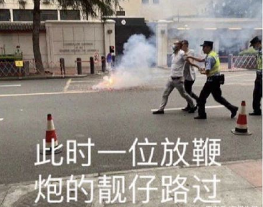 要说这最欢脱的,可能还是前方的成都市民。大概是觉得红色的消防车不够喜庆,成都的“豪气大哥”抱着一大卷的大红花炮到美领馆门前燃放,展现出了礼仪之邦“以礼送客”的大国风度:
