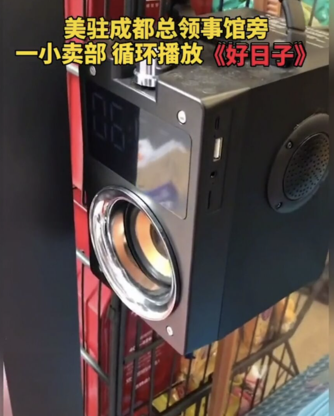 鞭炮都放了,欢乐的音乐自然也少不了。正对着美国领馆的杂货铺,很应景地循环往复播放《好日子》,歌词“门外的灯笼露出红红的光景,好听的歌儿传达浓浓的深情”更是表达了成都人民送客的干脆之意: