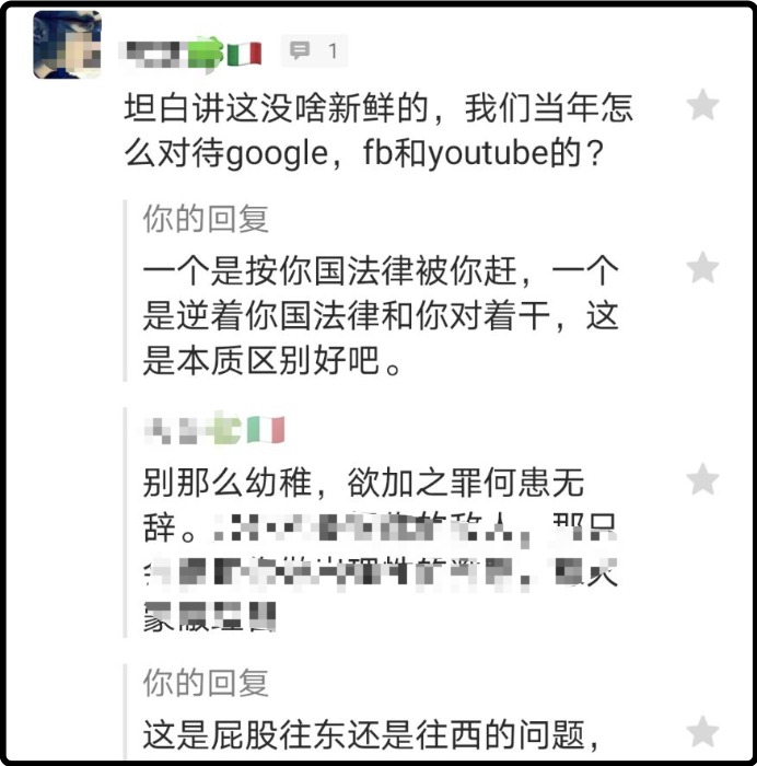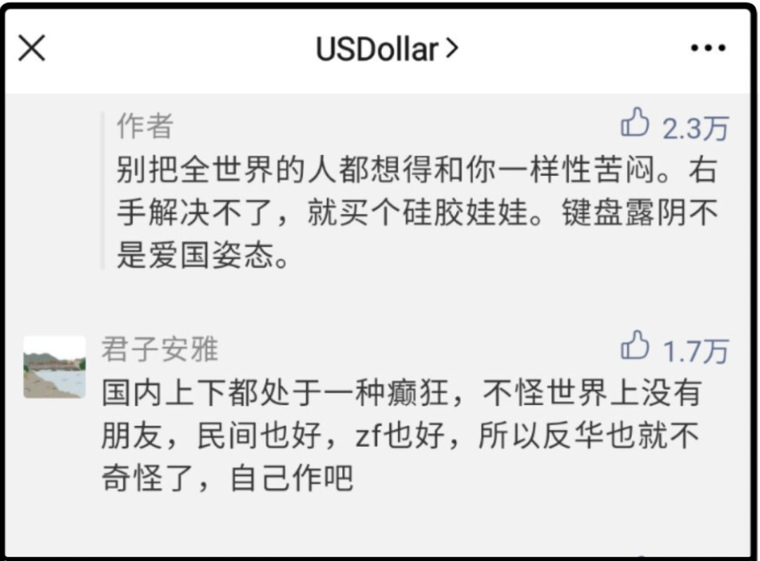 这离奇的画风,让人顿觉匪夷所思,但这也恰恰说明了,“假洋鬼子们”对美国的忠心是日月可鉴的,更是一般普通的美国主流白人无法企及的,毕竟“假洋鬼子们”是冒着千古骂名和祖坟冒烟的危险跪舔美国的呀!眼前发生的这一切,让我想起了最近写稿子谴责西方时遇到的一些事。例如此前我写文章支持华为、谴责美国霸权的时候,就有一个自称“做了二十年记者”的人留言告诫我:我劝你多读点书,以我做几十年记者的经验告诉你,你就是太年轻才会看不到国外的好,与其谴责美国不如学学人家的优秀,年轻人糊涂,建议多出国看看。(然而郎君已经在国外很多年了,也去了二十多个欧美国家了)好家伙,美国以一国之力绞杀华为公司不是错,倒是我们这些质疑美国的人犯了“读书少”的错,这是何等的忠心才会有此般逻辑呀?