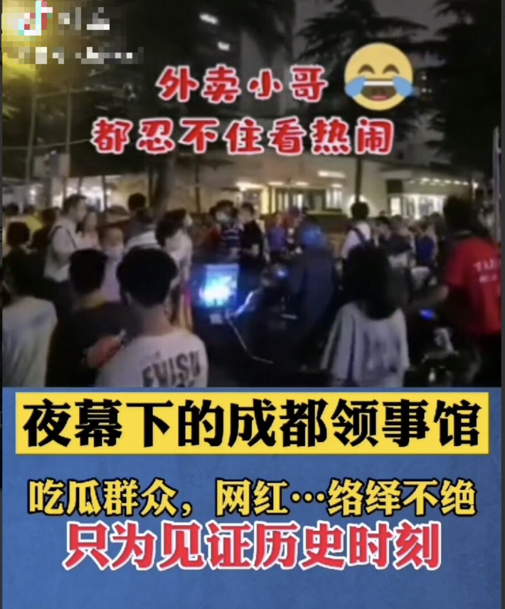 到了夜里,这样的节日气息依旧浓烈,百忙之中的成都人民不忘“深厚情谊”,几经辗转来到了美国领馆外,开起了“此情绵绵长久矣”的欢送派对: