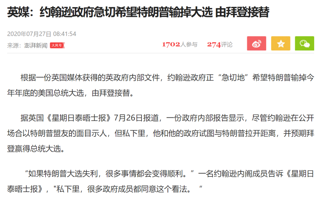 7月26日,《星期日泰晤士报》报道,约翰逊政府急切地希望特朗普输掉今年的大选,由拜登接替。