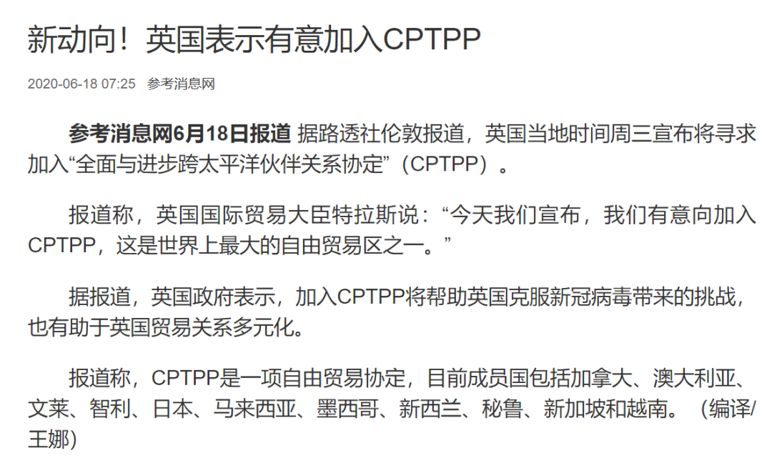 甚至,自6月份开始,约翰逊政府一直强调加入多边贸易谈判:全面与进步跨太平洋伙伴关系协定”(CPTPP)。