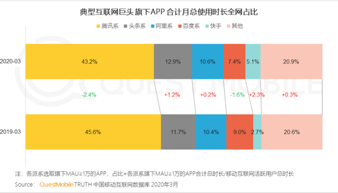 根据QuestMobile本月发布的《 2020 移动互联网全景生态报告》,过去一年,在用户量增长近乎停滞的状态下,中国移动用户月人均使用时长增长了12.9%,由2019年4月的128.2 小时增长至2020年4月的144.8小时。特别是疫情以来,网民对移动互联网依赖加大,互联网的使用时长比日常增加21.5%。