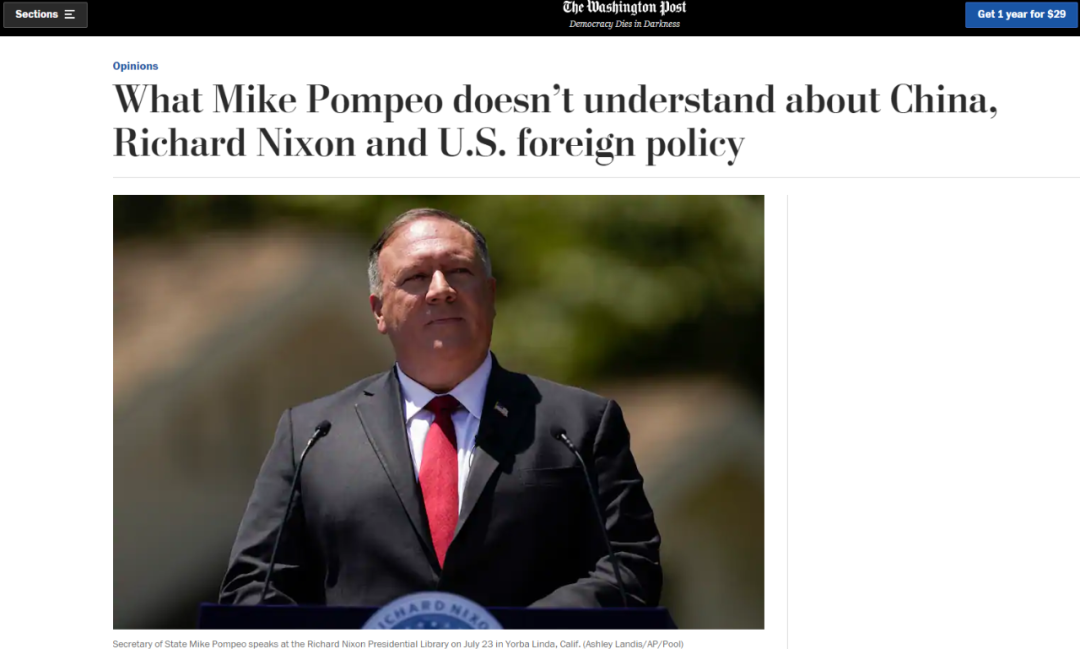 7月23日,蓬佩奥在加州尼克松故乡发表了一番猛烈攻击中国的演讲,因其模仿70多年前丘吉尔“铁幕演说”的痕迹明显,被有些人称为“新铁幕演说”。