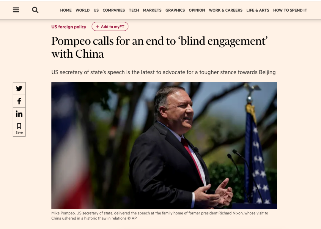 在英国《金融时报》一篇文章的开头,记者写道:“美国国务卿蓬佩奥宣布终结与中国‘盲目的接触’,并斥责了盟友们没有做到阻碍‘中国世纪’的到来”。