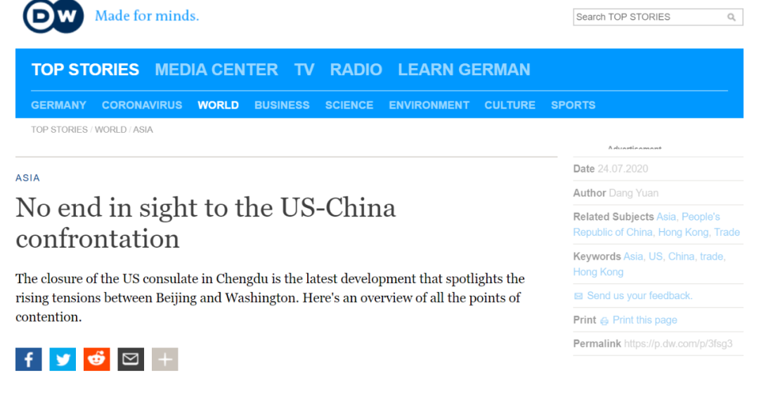 这篇报道在引述了蓬佩奥的几段话后,并没有做进一步评论,而是历数了之前中美发生过的冲突,包括贸易战、科技战、新冠肺炎、南海问题、香港国安法、台湾问题。这种客观陈述事实、没有感情色彩的报道方式,对于以往“逢中必反”的“德国之声”而言可不多见。