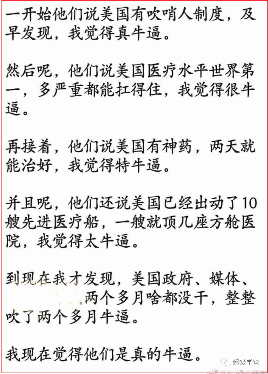 据说这年头公知美分不好混,很多人都转成了粉红自干五。但是我不知道为啥,想选择逆行,我越来越佩服美国政府、美国人民和美国文化了。