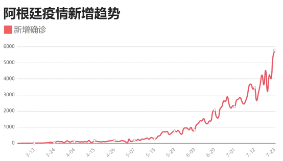 然而,新冠病毒全球大流行所引爆的经济问题,与一个世纪以来世界上出现的任何一次经济危机都不一样,无论以往的经济危机多么严重,人们的活动不会被大规模封锁,还可以进行相对正常的生活与生产活动。当经济危机爆发的时候人们的需求骤降,但供给却还正常,有些企业在需求萎缩的时候为了换取现金流甚至还需要低价倾销,导致供给压力加大,价格下跌的压力也加大,这就导致通货紧缩的威胁像海啸一样到来,这时,央行采取宽松的货币政策以抵御通货紧缩的做法是合理的。但新冠病毒的全球大流行所带来的影响与以往的经济危机是有明显区别的,在需求暴跌的同时,全世界数亿甚至数十亿的人们被禁足,生产活动被破坏得就更加严重,虽然商品市场在短期体现出通货紧缩的压力,但随着生产中断、供给暴跌之后,就会快速反转体现出通胀的压力。这种力度有多猛?本人预计很可能是我们从未曾经历过的那么猛烈。通货紧缩和通货膨胀的转换在经济数据上已经清晰地体现了出来。美国6月的年通胀率是0.6%,与5月的0.1相比出现了快速的反转。欧元区也一样,3月至5月的通胀率分别为1.0%、0.7%、0.1%,这一时间段明显体现出通货紧缩的压力,但6月的通胀率却是0.3%,也是逆转的势头。这种现象不仅出现在欧美等国家,也出现在发展中国家。3月,阿根廷的通胀月率尚为3.6%,随着新冠疫情的爆发,在4月大幅回落至1.4%,但5月和6月就出现了明显的回升走势,分别为1.5%、2.0%。必须注意的是,无论美国还是阿根廷的通胀回升都不能归结于疫情减缓、需求回升的因素,因为美国和南美洲的疫情还处于加速爆发的态势,下图为阿根廷的每日新增病例走势图。显然,5月和6月的通胀回升由货币加速贬值所推动,更重要的是,这应该意味着新冠病毒的全球大流行对全球生产活动的破坏所造成的供给下滑开始发挥作用。新冠病毒还会长期在世界流行这基本上已经是很多科学家的共识,这意味着供需两端低迷的状态将是常态。但是,生产所受到的打击是全面性的,无论生活必需品还是工业用品的生产都会受到同样的打击;而需求方面受到的打击却是结构性的,非必需品的需求受到的打击会很严重,但必需品的需求所受到的打击会比较小,这就是通胀在短期内即掉头向上的根本原因。目前,无论美国还是阿根廷,都是世界上最主要的商品生产国,美国如今已经是世界上最大的原油生产国,美国与阿根廷也都是世界上主要的粮食、肉类出口国,它们出现通胀掉头的信号是十分值得警惕的。