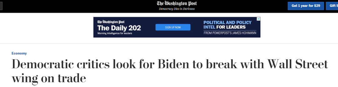 《民主党批评人士期待拜登在贸易问题上与华尔街的一派决裂》