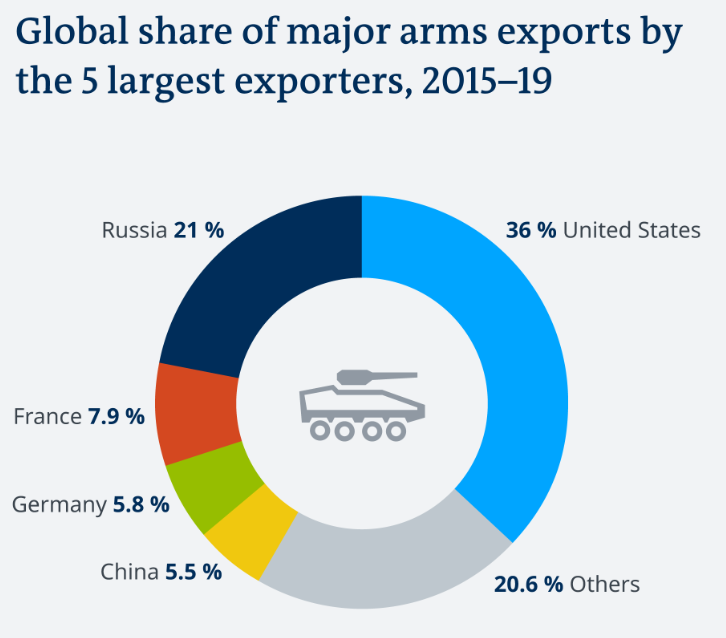排名第一的是美国,全球军火贸易的市场份额为36%。毫不意外,这就是战争贩子。