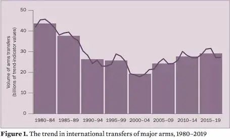 我们再看一张图,1980年到2019年之间的全球军火贸易成交趋势图,5年为一个统计单位,1980-1984年最高,然后逐步下降,自2000-2004年以来触底后连续增加。