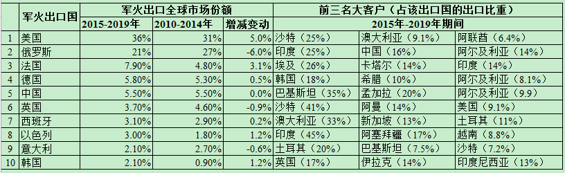 详细说明了2010-2014年和2015-2019年军火交易的前十名的市场份额和增减,以及各自的大客户。