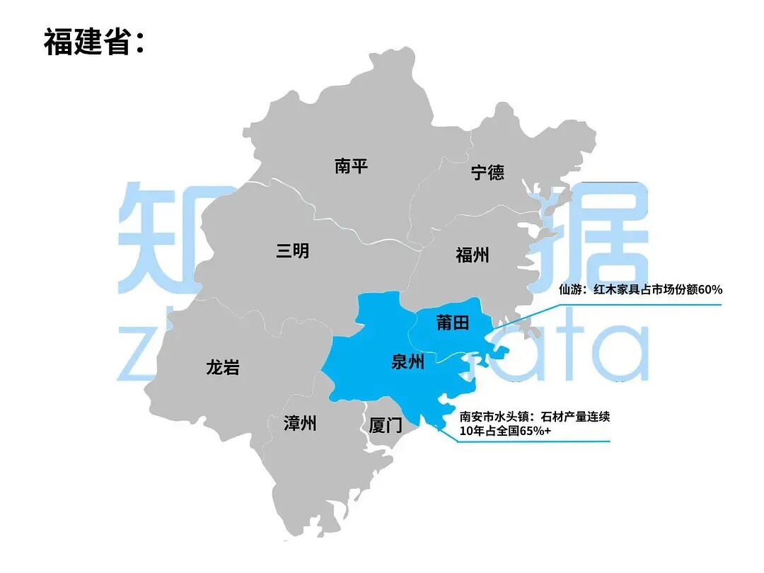莆田市仙游县,红木家具产量占全国市场份额60%以上,其家具制作历史可追溯到北宋。福州市平潭县,修建了全国80%的隧道项目。