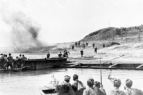 志愿军和朝鲜人民军战士渡河作战。