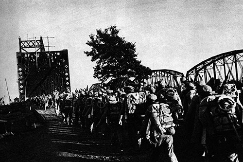 志愿军某部通过鸭绿江桥。